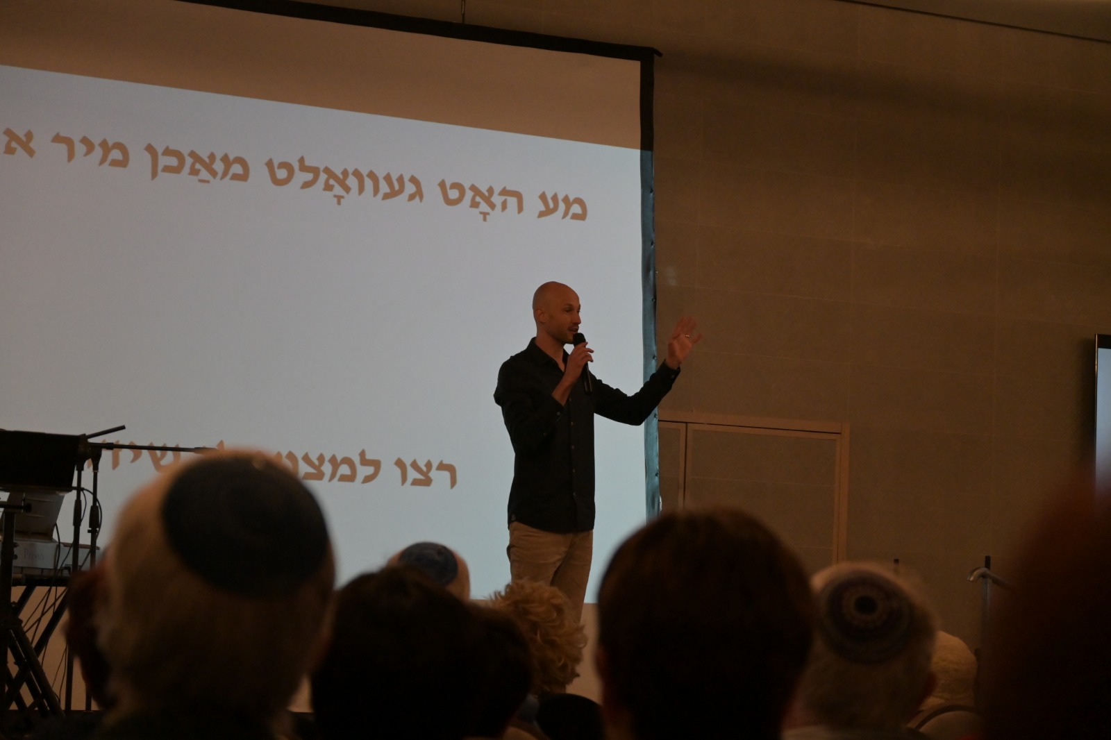 המופעים מועברים לפי צורכי האירוע: ההנחיה לרוב בעברית, והשירה/קטעי הווידאו ביידיש עם תרגום מלא לעברית (ובמידת הצורך גם באנגלית). כדי שהחוויה תהיה נגישה וחזקה גם למי שלא שולט ביידיש, אני משלב במהלך ההופעות הקרנה על מסך: מילות שירים, תרגומים ואיורים שמוסיפים אווירה, מחדדים את הסיפור—וגם יוצרים רגעים מצחיקים ומדויקים כחלק מההומור של המופע.